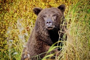 Welp, I was so fixated on the white cub and getting us in to a good location to photograph it and its family, I had disregarded my learned caution and stuck close to the right river bank and all my attention was focused on the white cub. We were about halfway to the spot I wanted to set up when I gradually heard my name being called by the guide Tanner.  I learned later he had said my name 3 times before it registered with me and I reacted.  I heard “John, move to your left”.  I quickly processed that information, not needing a reason why since I figured that if he was saying that, there was probably a good reason.  I figured there was something on my right side that he wanted to move me away from.  Instinctually, I looked to my right to see what was there.  The river bank and grasses were about 4-5′ tall, so I was almost looking at ground level as I turned.  What I saw almost made me soil my waders!  The bear was above me on the bank, 8-10′ away, staring right at me, was a BIG grizzly bear!!!!  It had appeared from the grasses and was looking intently at me!  Oh Sh*t!  I remember its head as being so huge and imposing and it did not have a friendly look on its face. A flash of panic overcame me as I started to step to my left.  My primal instinct, fight or flight, told me to run away, however that’s the worst thing you can do as it could trigger the “prey response” in the bear.  So calmly I began to move as quick as I could to the left away from the bear.  And remember, we were walking in a river and the rocks underneath were slippery and loose and I had this fleeting thought that I would trip and fall into the river and trigger the bear to lunge!  Thankfully that did not happen and I was able to move a safe distance away.  Someone else in our group managed to snap a picture of the ninja bear the almost got me. With adrenaline still coursing through my system, I made it further in to the side channel and we set up in a location that was the best photographically for mom and her two cubs.  We had a great photo session with the bears, lasting about 30 minutes as they fished and waded in the water.  Eventually they crossed the river into the brush and disappeared.